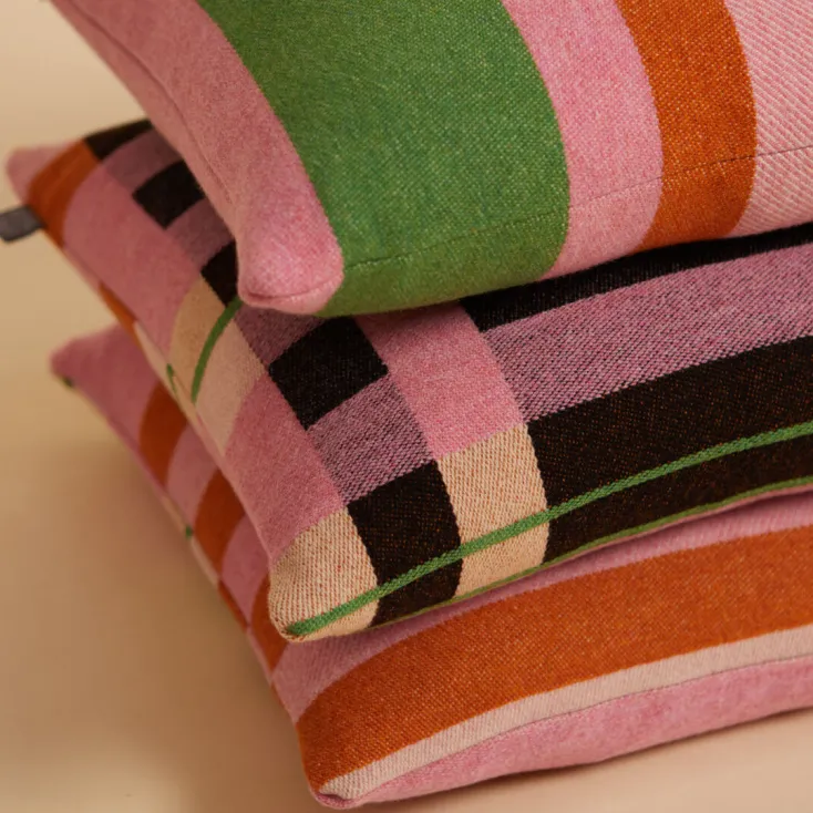 Inspiriert von den bahnbrechenden Ideen der Bauhaus-Bewegung und der Künstlerin Gunta Stölzl, vereint dieses Kissen kunstvolle Muster und erstklassige Handwerkskunst – eine perfekte Ergänzung zu den Decken!