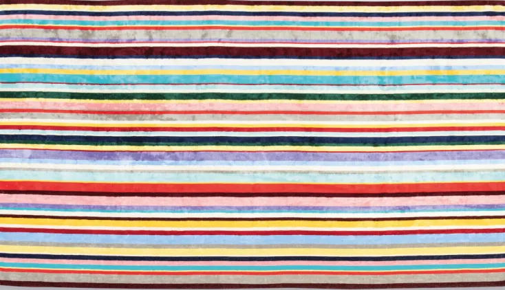 Das riesige Luxusbadehandtuch im Multicolor Streifendesign umfasst ein pures Kuschelerlebnis und ist der ideale Begleiter für Terrasse, Strand oder Schwimmbad.