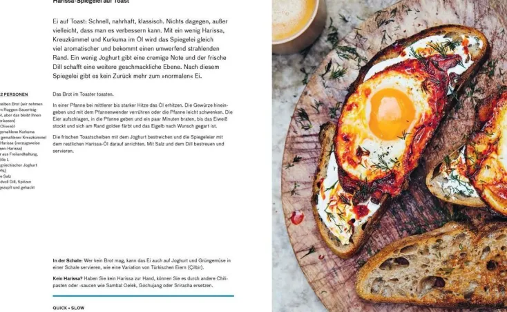 - Morgenstund: Harissa-Spiegelei auf Toast / Sonnenscheinsalat mit Kokosnuss-Creme + Kokos-Dukkah / Schoko-Waffel-Toast mit Granola-Butter