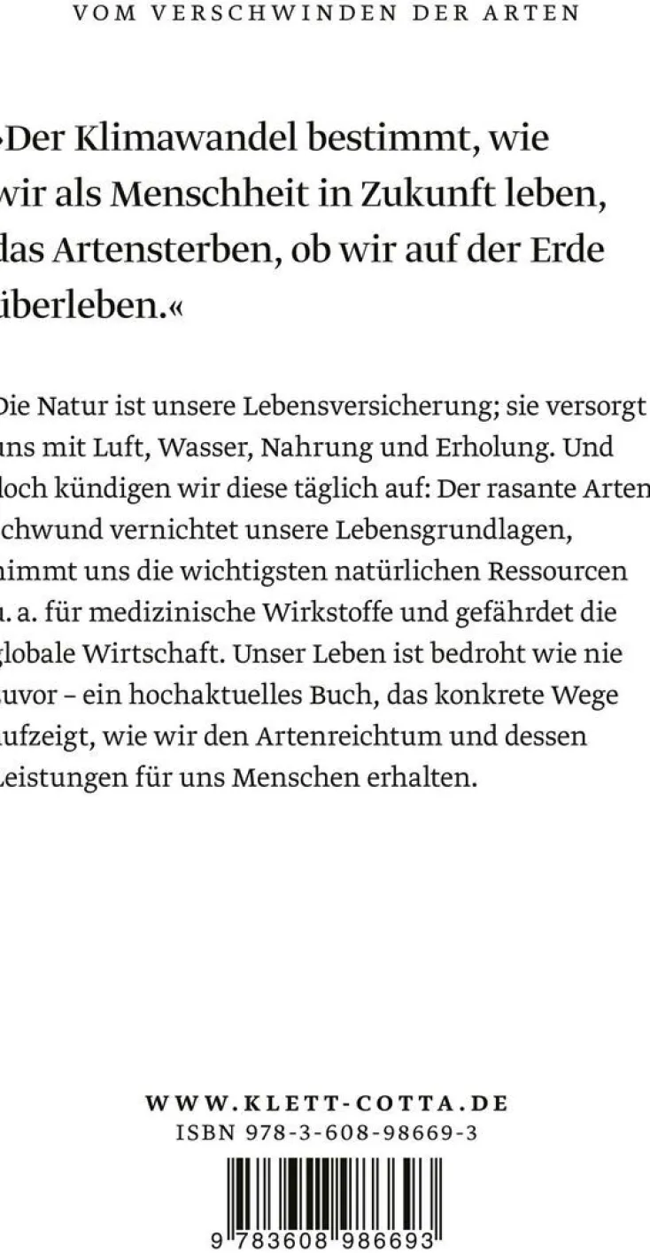 Die Natur ist unsere Lebensversicherung; sie versorgt uns mit Luft, Wasser, Nahrung und Erholung. Und doch kündigen wir diese täglich auf: Der rasante Artenschwund vernichtet unsere Lebensgrundlagen, nimmt uns die wichtigsten natürlichen Ressourcen u. a. für medizinische Wirkstoffe und gefährdet die globale Wirtschaft. Unser Leben ist bedroht wie nie zuvor – ein hochaktuelles Buch, das konkrete Wege aufzeigt, wie wir den Artenreichtum und dessen Leistungen für uns Menschen erhalten.