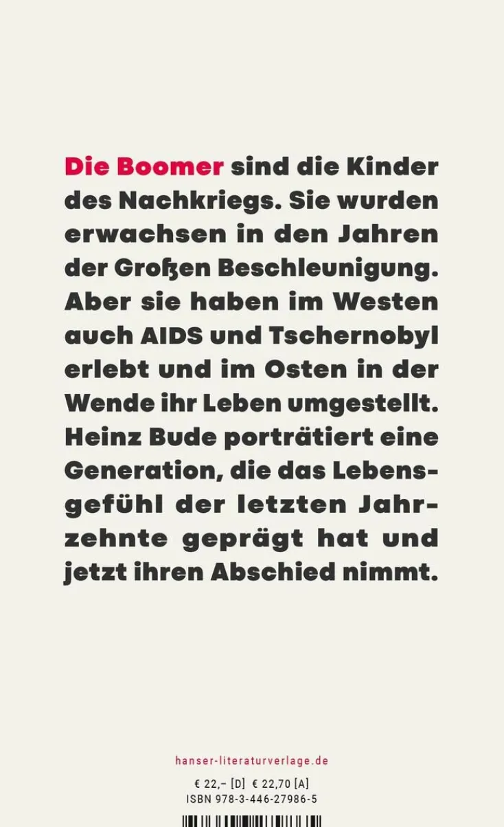 Bye, bye, Boomer! Das Portrait einer Generation und ihrer inneren Widersprüche von Heinz BudeDie Boomer nehmen Abschied. Wer zwischen 1955 und 1970 in der Zeit der geburtenstarken Jahrgänge zur Welt gekommen ist, hat den Ruhestand erreicht oder zählt zu den Älteren, die nach und nach ihre Posten freimachen. Die Boomer verbindet das Gefühl, dass es zu viele von ihnen gibt, das spürten sie schon in überfüllten Klassenzimmern und später auf dem Arbeitsmarkt. Daraus resultierte eine Haltung der Skepsis, und die Erfahrung von AIDS und Tschernobyl hat sie in einer entscheidenden Phase ihrer Biografie gelehrt, dass nichts gesichert und gar nichts garantiert ist. Heinz Bude, ein früher Boomer, beschreibt, wie sich mit dieser Generation auch ein Lebensgefühl verabschiedet, das unsere Gesellschaft über Jahrzehnte geprägt hat.