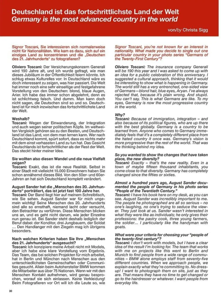 Die Initiative »Die Deutschen des 21. Jahrhunderts« ist mit ihrem Kaleidoskop aus Gesichtern ein Spiegel menschlicher Vielfalt und ein Beleg für die Stärke und die Weiterentwicklung der deutschen Gesellschaft. Sie hat gezeigt, dass sie in der Lage ist, diese Vielfalt zu integrieren. Die Initiative gibt der Philosophie des Neuen Humanismus eine Form. Für ihre Realisierung könnte es keinen geeigneteren Künstler geben als Oliviero Toscani. Toscani, der namhafteste Fotograf seiner Generation, fängt die Schönheit unserer Spezies in all ihren Farben und Nuancen ein. Er bekämpft Stereotype und zwingt den Betrachter dazu, den Blick zu weiten, zu reflektieren und an der Großartigkeit der Menschheit teilzuhaben.