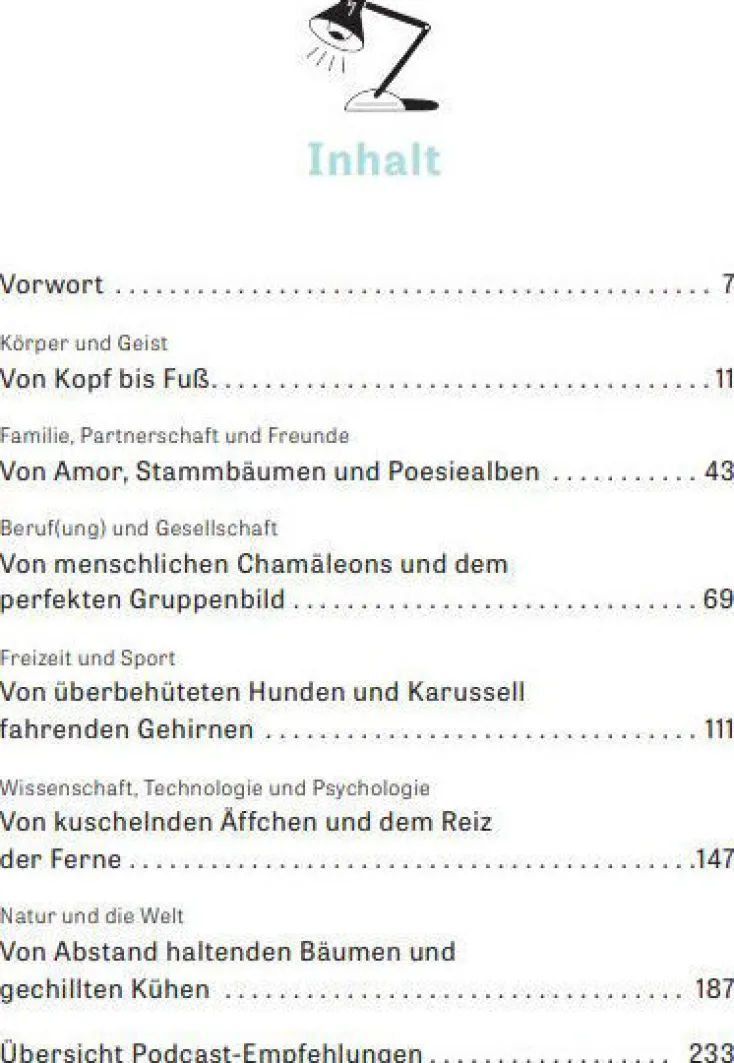 Woher kommt bloß der ganze Sand am Strand? Wie viel Platz brauchen wir zum Leben? Warten Tiere gelassener als wir? Wächst man wirklich mit Aufgaben? Wie kann ich vermeiden, so zu werden wie meine Eltern? Und warum fangen Männer auf Partys später als Frauen an zu tanzen?